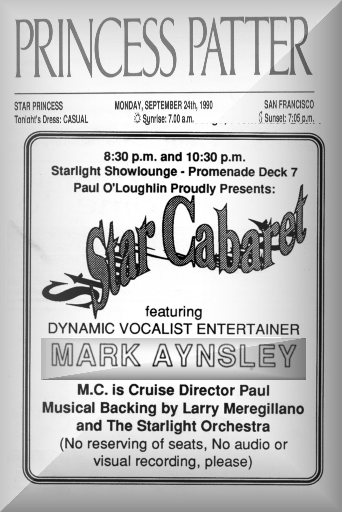 On two occasions Mark has been part of the three member team representing Gt Britain at the European Song Festival, held at Knokke, Belgium, and on each occasion they have been the winners. This introduced Mark to the international music scene, resulting in him touring and performing in Norway, Malta, Las Palmas, The Gambia, and the casino circuit in Portugal, whilst periodically entertaining passengers on P&O cruise liner Canberra and Oriana. In the nineties, he was one of the star guest entertainers on board the Star Princess, for Princess Cruises.
